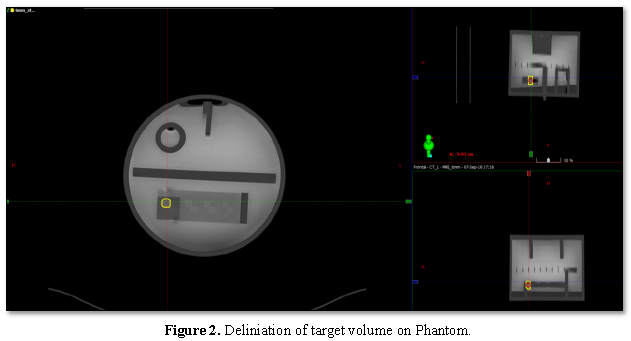 It is made of acrylic plastic, glass, silicone. Ferromagnetic materials were removed. It is 20.4 cm in diameter and 16.5 cm in length. There are 11mm thickness resolution components. The width between the halls is 1.1mm, 1mm and 0.9mm (Figure 1) [11]. Target volumes were determined on the phantom (Figure 2).