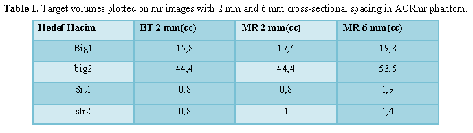 In our study, we obtained MR images of MR phantom with 2mm and 6mm cross-sectional thickness. We compared CT images with 2 mm cross-sectional thickness to 4 different volumes. We evaluated 10 different target volumes from 4 patient imaging. We evaluated the 2 mm and 6 mm cross-sectional MR images and the target volumes obtained from 2 mm cross-sectional CT images volumetricly(Table 1).
