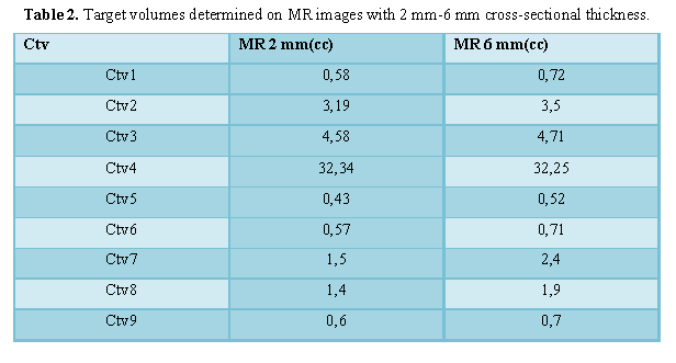 The target volumes were determined on the MR image by combining MRI and CT images by the radiation oncologist (Figure 3). Ten target volumes from four different patients were plotted on 2mm and 6mm fusion MR images separately. The data were analyzed by paired student t test. The target volumes obtained are shown in Table 1 and Table 2.