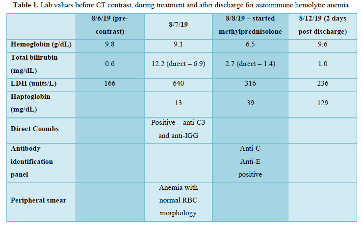This case report details a patient who developed severe hemolytic anemia following IV contrast medium (CM). There are a variety of iodinated compounds used as CM for diagnostic procedures, including imaging such as computed tomography (CT). These compounds include four subclasses consisting of nonionic, ionic, monomeric, or dimeric substances. The subclass of nonionic iodinated compounds includes iomeprol, iopamidol, iohexol and iotrolan. These compounds have been well-studied, and known side effects include localized pain, heat sensations, taste disturbances, and pseudo allergic reactions [1]. However, there have been two previously reported cases of immune-mediated hemolytic anemia following administration of iomeprol (Imeron) [2,3]. In addition, there has been one report of complement-mediated hemolysis following injection of an older ionic contrast medium, metrizoate (Isopaque) [4]. These cases occurred in female patients who had previously tolerated CM and included various markers of immunemediated hemolytic anemia. These patients also had symptoms of agitation, tachycardia, vomiting, decreases in hemoglobin (Hb) concentrations, increases in lactate dehydrogenase, positive C3d-DAT, and presence of CM-dependent antibodies [2,3]. Here we describe a subsequent unexplained case of immune-mediated hemolytic anemia following CT imaging with iohexol (Omniapaque) CM in a 58 years old female while on treatment for adenocarcinoma of the lung with nivolumab and IL-10 therapy.