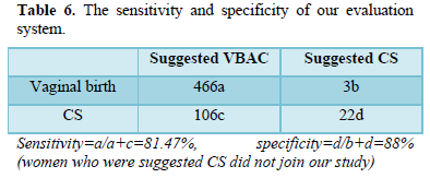 However, patients attempting VBAC need to be counseled about the advantages and disadvantages. Nearly 15% women abandon their VBAC plans after first visit. 25% women choose to drop out of TOLAC at the last moment because of all kinds of reasons including fear and pain, even though we suggest TOLAC to them (Table 5). Some candidates dropped out of VBAC because of our medical suggestions. The common reasons that ruled women out of TOLAC included: macrosomia, previous caesarean scar defect, cephalopelvic disproportion, placenta previa. The sensitivity and specificity of our evaluation system is 81.47% and 88% (Table 6).