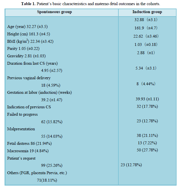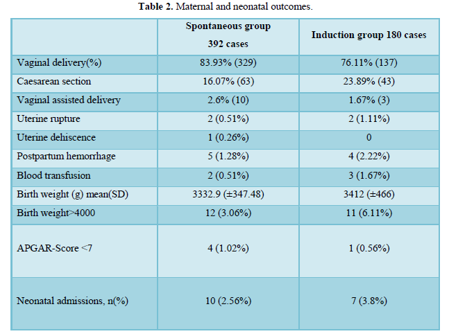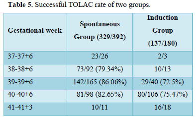 rate of successful vaginal birth among all VBAC candidates (466/572,81.46%) was higher than the reported success rates in previous study of 60-80% [17]. The vaginal birth rate of induction group is 76.11% (137/180) and that of spontaneous group is 83.92% (329/392). Statistically, the differences between the two groups are significant.
