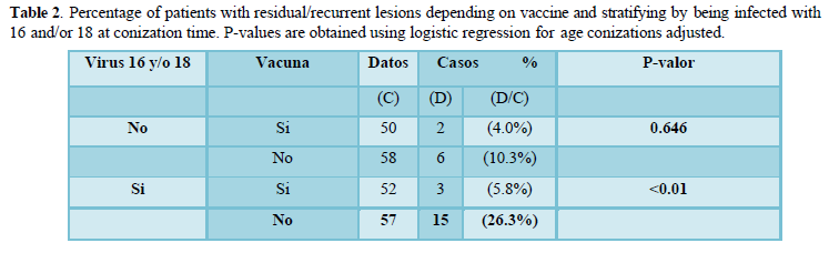 As Table 2 displays, if patient has 16 and/or 18 HPV serotype, the risk of having a recurrent lesion is clearly lower in vaccinated patients (5.8%) comparing to the ones who are not (26.3%). This difference is statistically significant even after adjustment for age (p<0.01).