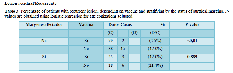 As Table 3 shows when surgical margins are free of disease, the risk of having a recurrent lesion is lower in patients with vaccine (2.5%) than ones who does not (17%). This is statistically significant even after adjustment for age (p< 0.01). However, when surgical margins are affected there is no statistical significance found for relapse between patients vaccinated and patients not (p= 0.889).