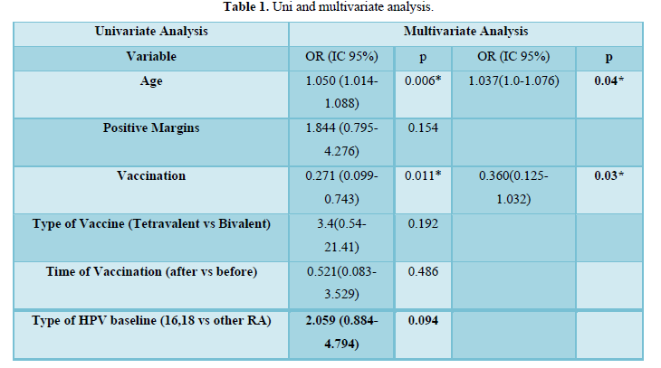 A total of 242 patients met the requirements of the study to be included, of whom had follow-up care for at least two years. The median age of the 242 patients was 36 years. Of these, 28 patients (11.6%) were between 18-25 years old, 92 patients (38%) between 26-35 years old, 62 patients (25.6%) between 35-45 years old and 60 patients were older than 45 years. 88.8% of the patients were of Spanish nationality. Of the 242 patients, 27 (11.1%) had recurrence. The average time between recurrence and conization was 14.2 months (6-24 months). Of the 242 patients included in the analysis, 103 patients (42.6%) had been vaccinated, of them 70 patients (68%) received the bivalent vaccine and 33 patients (32%) the tetravalent vaccine. The moment of vaccination was 0-1 month before conization in 46 patients (44.6%) and 0-1 month after conization in 57 patients (55.4%).