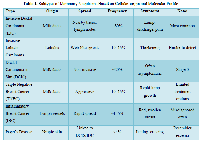 Subtypes of Mammary Neoplasms Based on Cellular origin and Molecular Profile (Table 1 & Figure 2)