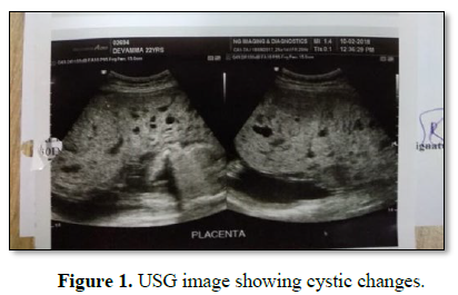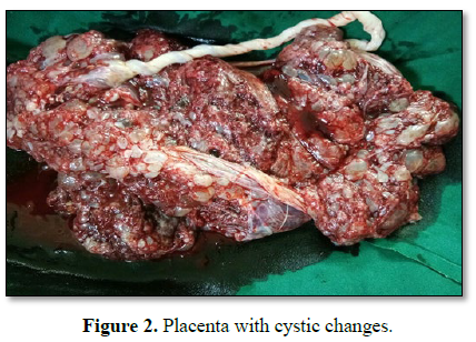 20 years old primigravida with 29 weeks period of gestation presented with preterm active labor. On examination she was normotensive, pulse rate was normal, with no pallor or pedal edema. Uterus was acting with 3 to 4 contractions lasting for 30 s with cephalic presentation and fetal heart rate was 140 beats/min. On per vaginal exam, cervix was soft, 5 cm dilated; bag of membranes present, vertex was at -2 Station. Investigations revealed hemoglobin of 10 g%. All the biochemical parameters were normal. APLA and TORCH profile were sent which was reported as normal. Patient delivered a live preterm male baby of weight 1.05 kg, placenta and membranes were expelled in toto which appeared unhealthy with cystic changes. Placenta was sent for histopathology which was reported as partial mole. Baby was in NICU for 45 days and was appearing normal. She was followed as per the standard protocol and beta human chorionic gonadotrophin became undetectable after about 8 weeks. Karyotyping was done which was reported as normal. Patient and baby were discharged after 45 days (Figures 1 and 2).