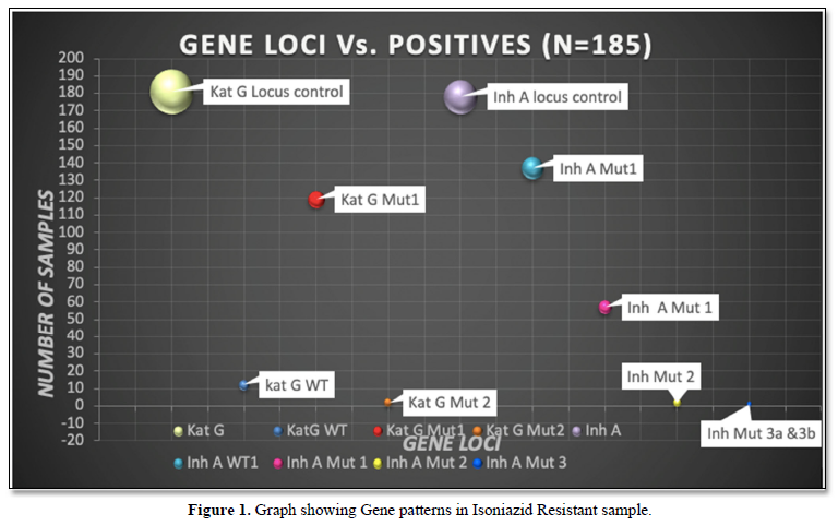 In 106 cases of Isoniazid resistance to Kat G, the expression was - locus control was present, Wild Types were absent, Mut 1 present and Mut 2 present. This clearly indicated that Isoniazid cannot be used even at higher dose and regimen has to be tailored accordingly.