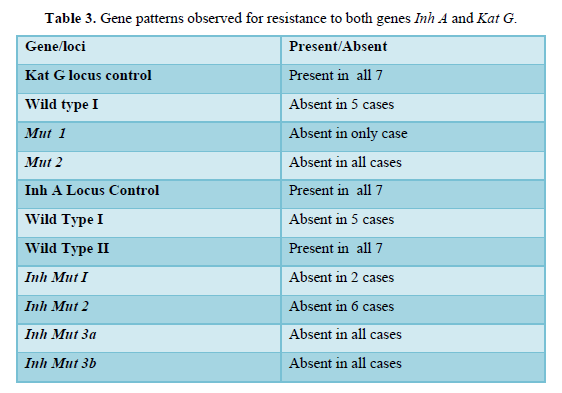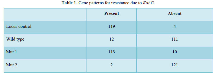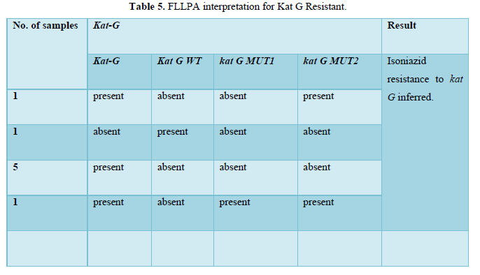 There were four cases in which the resistance was due to Kat G, all loci i.e. Kat G locus control, Wild type I and Kat G Mut 1 & 2 were absent which prompted resistance to Isoniazid.