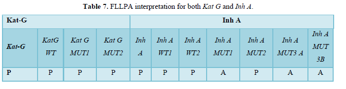 In one typical case where Isoniazid resistance was due to both Kat G and InhA, where resistance was inferred as follows (Table 7).