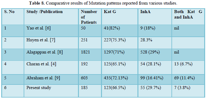 In many studies conducted in world on Isoniazid resistance the results were as follows (Table 8) and similar results were reported in our study too.