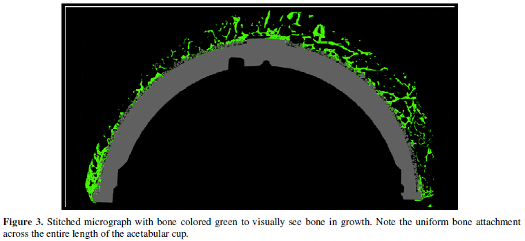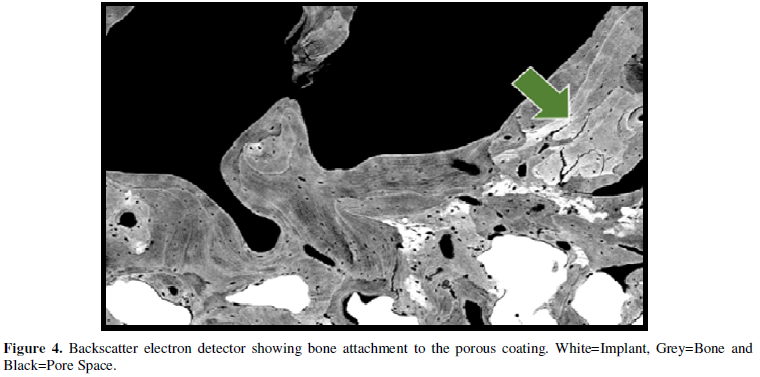 This component was treated in 10% neutral buffered formalin, dehydrated in progressively increasing concentrations of ethanol, infiltrated and fixed in polymethyl methacrylate. Following specimen hardening in PMMA, 3mm slices were divided, ground and polished. Specimens were stained and evaluated using light microscopy and images taken utilizing a scanning electron microscopy. Bone penetration was extensive demonstrating up to 54% bone present in the pore spaces of the porous coating. (Figures 3 & 4).