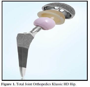 This study’s implant consisted of a double wedge Zweymuller-type stem made of a titanium alloy designed by Total Joint Orthopedic, Inc.’s. This Classic HD® stem (Figure 1) features a proximal porous Ti-Coat®, titanium ultra-porous coating (>60% porosity), for bony in-growth while the mid-stem is designed for bony on growth by finishing the stem with a grit-blasted titanium. The femoral prosthesis is non modular and collarless and comes in both 121- and 131- degree neck shaft angle constructs.