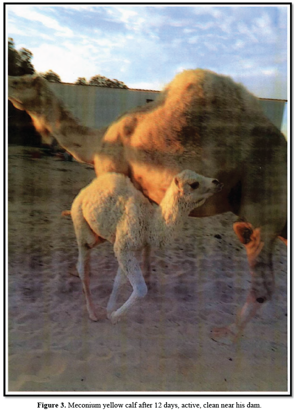 Meconium staining calves have been reported in New World Camelids [3]. However, no previous records of meconium-related disorders were recorded in Old World camelids which is also known as Camelus dromedarius. This case report is considered as the first record of meconium staining calf in Camelus dromedarius history.