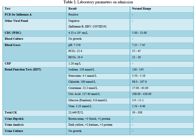 Urine analysis showed dark urine with blood and protein but ruled out urinary tract infection through negative cultures. These findings culminated in a provisional diagnosis of viral-induced rhabdomyolysis, leading to the patient's admission for further management. Table 2 shows the laboratory parameters on admission.