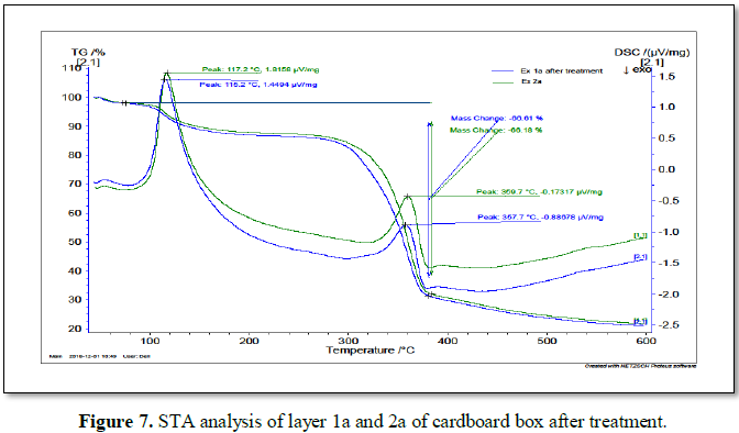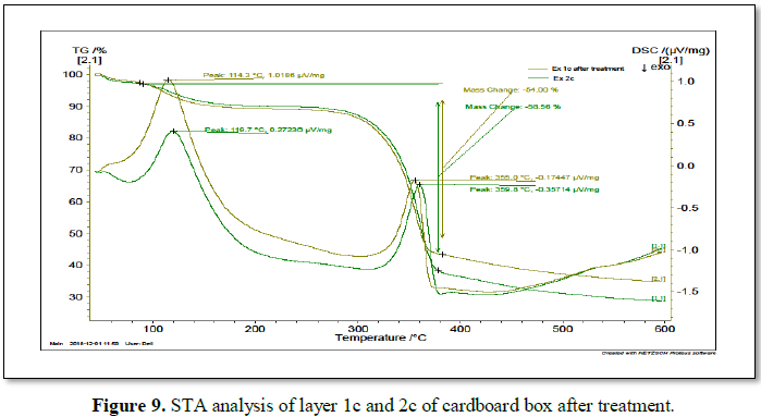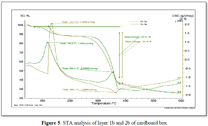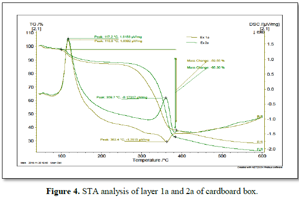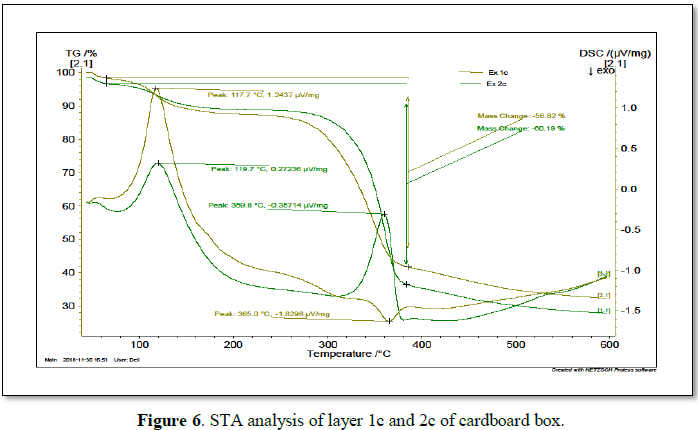 The thermal stability of cardboard is determined by testing the onset of degradation temperatures. TG curve for all the layers for ex no 1 and 2 (Figures 4-6) show decrease in the curve at about 300°C. Cellulose absorbs moisture and this moisture loss generally found in the range 75°C-127°C. Cardboard generally consist of cellulose fibers. The decrease in weight of the cellulosic fibers was observed at 206°C-400°C with the maximum decrease in weight loss about 60-65% in these temperatures. Literature on thermal degradation study of cellulose fiber reveals that decomposition of major components of the cellulose fibres4 and the depolymerization of hemicellulose occurs between 180 and 350°C [5] and the random cleavage of the glycosidic linkage of cellulose between 275°C and 350°C [6]. The cellulose molecule is a very long polymer of glucose units and its crystalline regions improve the thermal stability of fibers [6,7]. Higher thermal stability of Celluloses is attributed to the hydrogen bonds between cellulose chains that can lead to more ordered and packed cellulose regions and hence increasing the thermal decomposition temperature of cellulose [8].