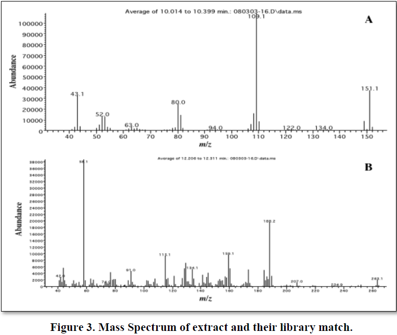 GC-MS studies were performed on Agilent technologies 5973 inert model mass selective detector using Column HPSMS 0.25 mm id 30 m length, 0.25m film thickness, 30mx250mmx0.25mm nominal with aux temp 280°C, intel temp 250° MS quadrupole 150 ion source 230, column flow 1.0 ml/min He as carrier gas, split mode 20:1 programming 100°C 2 min hold 20°C/min ramp up to 280°C, 500 volt total 16 min run.