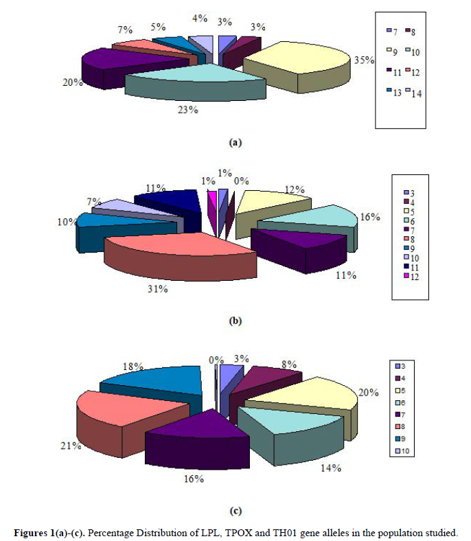 The percentage distribution of alleles of LPL, TPOX and TH01 loci in the population studied is shown in Figures 1(a)-1(c). For LPL locus, allele 9 was the foremost common allele found within the population studied and alleles 7 and 8 were present in very small population. Similarly, in TPOX locus, Allele 8 was the foremost common allele present within the subjects studied whereas alleles 3 and 12 were present in very small population. In TH01 locus, alleles 8, 5, and 9 were the foremost common alleles found in population studied and allele 3 was present in very small population. Allele 10 was the least spread allele found within the subjects studied.