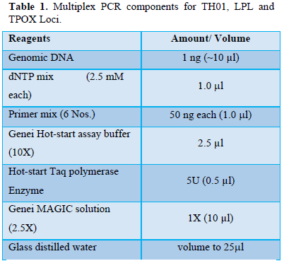 The current commercially available multiplex kits amplifies over and above 20 STR loci and generates amplicon sizes from 100 to 450 base pairs (the cost is 25-30 $ per sample). In degraded forensic samples, very often, DNA is fragmented. Hence, STR loci with larger amplicon sizes over 300 base pairs are either not amplified or the amplicon size decreases proportionally. Efforts are been taken to outspread the efficiency of STR markers in degraded biological samples [9-10]. Mini-STRS were developed, by making new primers which are near to STR repeat region, thus reducing the size of amplicon (80 to 300bp) [10-12]. The tiny size of amplicons increases the amplification efficiency in fragmented DNA. Besides this, mini-STRS amplifies three to five loci with few fluorescent dyes, which makes them less expensive than the commercially available kits. Within the present study, a miniplex was designed for 3 loci TPOX, TH01 and LPL. The distribution of alleles and other parameters were studied for unrelated individuals in Mumbai population.