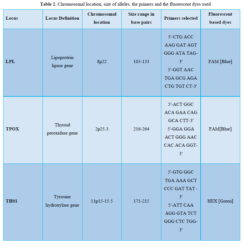Using the allelic frequencies calculated for all the three loci, a locus will be defined as polymorphic or monomorphic. By general definition, if the frequency of the foremost common allele is 0.99 or more and if all the opposite alleles combined have a frequency of 0.01 or less, then that gene or locus is taken into account as monomorphic, otherwise, it is polymorphic. The results of the current study showed that the locus of LPL gene is extremely polymorphic, because the frequency of the foremost common allele 9 was 0.35 and also the collection of all the alleles (expressed) frequency was 0.92. Furthermore, the loci of TPOX gene along with that of TH01 gene are highly polymorphic. The frequency of the foremost most common allele 8 for TPOX was 0.3458 and for TH01 was 0.215 and therefore the aggregation of all the alleles (expressed) frequency was 1.2926 for TPOX and 1.003 for TH01 (Table 3). Thus the presence or absence of alleles together with their percentage would help in the process of identification or individualization in various cases/ or for elimination of the probability of a personal within the event as the case could also be. A larger sample study would aid in data collection for preparation of database for comparison and identification of individuals.