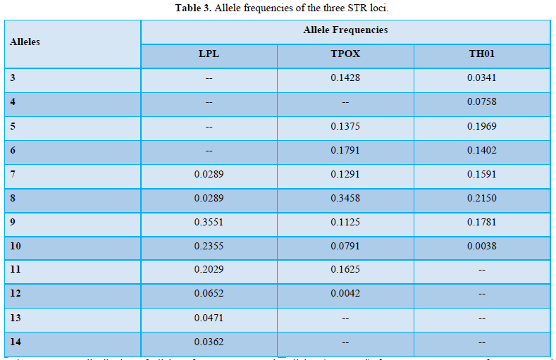 In the present study, out of the 36 possible genotypes from the eight alleles, 26 genotypes were observed in LPL locus, in TH01 out of 210 possible genotypes, from twenty alleles, 23 genotypes were observed and in TPOX locus, 26 genotypes were observed out of 120 possible genotypes from fifteen alleles. Table 3 shows the distribution of allele frequencies of those three loci. No micro-variant alleles were observed within the studied population.