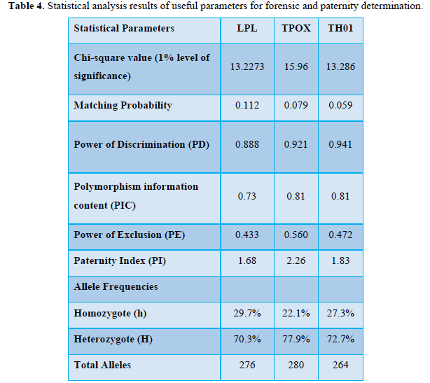 Other than the allelic and genotype frequency calculations, the power of discrimination (PD), the power of exclusion (PE), the polymorphism information content (PIC) have been also studied to seek out the usefulness of LPL, TH01 and TPOX as gene marker (Table 4).