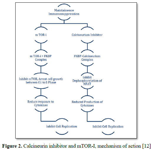 mTOR-I and tacrolimus act by initially binding FK binding protein (FKBP). CNI-FKBP complex then inhibits calcineurin. mTOR inhibitors do not inhibit calcineurin but act on the mammalian target of rapamycin, which is a key kinase. When inhibited, would result in blockade of cell proliferation in G1 to S phase [12]. The effect is seen in both hematopoietic and non-hemopoietic cells [7]. CNIs inhibit the production of cytokines. mTOR-I block the response to cytokines especially interleukin 2 (IL2) in B and T cells failing cell proliferation [12] (Figure 2).