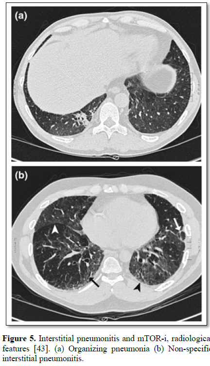 Interstitial pneumonitis (Figure 5) remains rare, but a potentially fatal complication of m-TOR I. In a case-cohort study [43], the incidence of m TOR related pneumonitis remained 12.7%. The pneumonitis is of two main types: