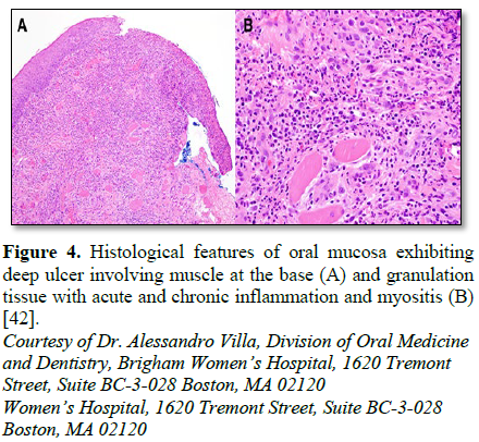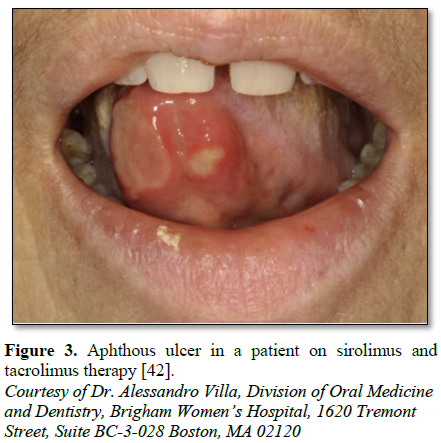 Many of these effects might be related to drug doses, such as stomatitis (30-60%) and pneumonitis. However, others are idiosyncratic and unrelated to the duration of treatment [41]. Figures 3 and 4 demonstrate the features of sirolimus-induced mouth ulcers [42,43].