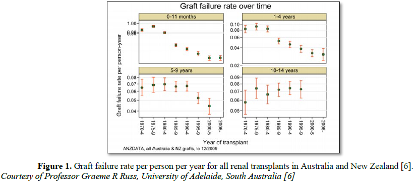 Data from Australia and New Zealand Dialysis and Transplant Registry shows that from 1995-2000, in deceased donor transplant recipients, 72% were alive 10 years after transplant. 20% of these had returned to dialysis. Hence only 59% were alive with working graft. The death rate was 2.5% per year in these patients. In Australia in 2010, 32% of deaths were due to malignancy, 23% were due to cardiovascular causes and 22% due to infection [4]. Figure 1 demonstrates the graft failure rate per person per year for all renal transplants in Australia and New Zealand. A gradual decline in graft function is seen with time, and the data shows the risk of graft failure increase substantially in recipients more than 10 years post-transplantation [6].