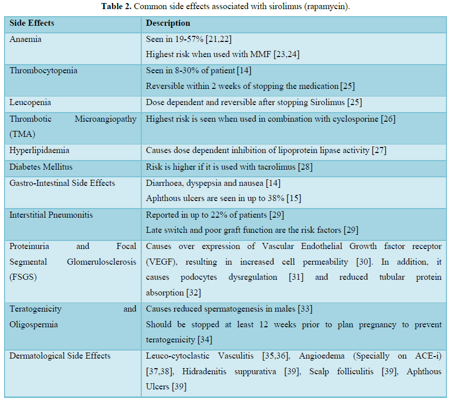 In a systematic review done by Lim et al. conversion from CNIs to m mTOR-I in renal transplant recipients due to adverse effects was 21.6% and 9.6%, respectively for mTOR-I and CNI respectively. Overall, the adverse events were more frequently recorded in patients on mTOR-I [44]. It is therefore important to educate patients about the potential toxicity of the drug and monitor drug adherence during follow up.
