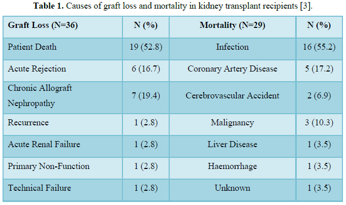 Sepsis, cardiovascular disease and malignancy remain the commonest causes of death in renal transplant recipients (Table 1). Immunosuppressive medications contribute significantly towards recipient’s mortality increasing risk of infection, malignancy, diabetes, hyperlipidaemia and atherosclerosis [3,5].