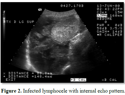 USS appearance can also indicate the possible presence of infection within the collection. Complex echo pattern with internal debris within the collection is more indicative of complicated infected lymphocele (Figure 2) [23]. An uncomplicated lymphocele appears hypoechoic or anechoic compared to the hyper-echoic appearance of an infected lymphocele. Further imaging with computerised tomography can also assist in differentiating innocuous lymphoceles from infected ones and other collections such as hematomas.