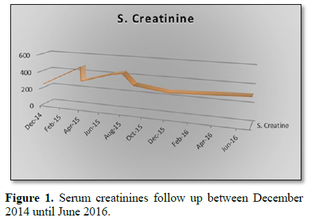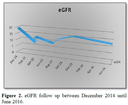 The above-mentioned regimen stabilised her myeloma parameters with total protein around 7 g/l and kappa: lambda chain ratio of around 20. By the end of July 2016, serum creatinine plateaued at reading 317 mmol/l (eGFR 13 ml/min) (i.e., after 3 months of the last dose of Velcade® which was at the end of April 2016) (Figures 1 and 2).
