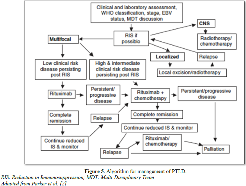 Despite numerous attempts to standardize a prognostic scoring system for PTLD, there is no consensus in this regard. Factors included in the International Prognostic Index for Non-Hodgkin Lymphoma in non-transplant setting have not been found to correlate accurately with prognosis of PTLD. Different study groups have attempted to define possible poor prognostic indicators based on their individual patient cohorts. Some of the identified poor prognostic indicators are poor general health, EBV-ve disease, hypoalbuminaemia, CD-20 positive disease, primary CNS disease, graft involvement and monomorphic pathology [16,39,40] (Figure 5).