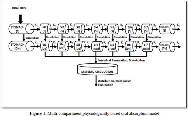 Following this work, Physiology, Pharmacokinetics (PK) and Pharmacodynamics (PD) were integrated into the picture. Nowadays, physiologically based (PB) Pharmacokinetic modeling (PBPK) becomes popular and several commercial software are available (e.g. Gastroplus (Simulations Plus, Lancaster, CA) and Simcyp (Certara, Sheffield, UK)). These PBPK platforms describe the absorption process using the multi-compartment approach (Figure 1) with both dissolution and absorption in each compartment to allow the best estimation of drug absorption in different segments of the GI tract. Meanwhile, the distribution, metabolism, and elimination are integrated accordingly. Furthermore, researchers continuously are working on new approaches to improve the prediction of oral absorption [5-8]. This software rapidly gain popularity within the industry as a critical tool in optimizing oral drug delivery in both discovery and development phases. The advantage of such a tool/model is to provide a clearer picture of each important process that affects oral exposure (dissolution, absorption, distribution, metabolism and elimination). This ability allows the researchers to troubleshoot and predict the formulation impact on the oral absorption with mechanistic understanding, for example, the impact of doses, change of solubility (e.g. amorphous versus crystalline), particle size and release rate (GI region) in the formulation on the exposure (PK) of the drug. Additionally, it helps to understand the rate-limiting step for the oral absorption of a drug. For a drug to reach systemic exposure, absorption is the first process. With the mechanistic understanding of how a formulation can influence the absorption and PK profile ( i.e. Cmax, Tmax, AUC) of a drug upon oral dosing, as well as understanding the key rate-limiting step for absorption, formulators can better optimize a drug formulation earlier in the drug development cycle, reducing the need for formulation changes later in development.