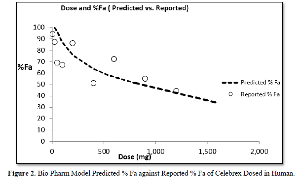 The clinical stage is often considered as the most critical stage of the drug discovery and development since it is a key decision point for a new molecule and/or therapeutic target. In this stage, data such as exposure, tolerability, PK/PD and efficacy in humans are generated for evaluation. Due to the cost and ethical considerations, it is often more difficult to conduct multiple studies in human subjects to answer a specific question, hence, modeling plays a more important role in this stage. For example, the impact of the amount of an excipient on the human oral exposure in the formulation, the particle size of the API, and solid form are often considered during the development. Since testing all conditions and doses in humans are very difficult and expensive, modeling and simulation are used extensively in this area. Usually, the impact of each variable on oral absorption (hence the exposure) will be simulated providing the boundary condition. For example, Figure 2 is a plot of the Bio Pharm model predicted % FA against reported % FA of Celebrex dosed in humans [9]. Although data some variability is observed, the model predicted the reduction of % FA following the increase in dose in humans. Such prediction is very useful to the clinical team regarding what to expect when doses are escalated, and the potential need for finding a new formulation if higher exposures are needed. Other capabilities of modeling and simulation such as prediction of the effect of food and the potential impact of co-administered proton pump inhibitors (leading to increased gastric pH) are extremely useful for compounds at the clinical stage to initiate or prioritize the assessment of these factors in clinical studies. On top of that, software which have the capability of modeling other relevant pharmacokinetic characteristics and situations such as drug-drug interaction (DDI), non-linear pharmacokinetics, and non-linear absorption (permeability) are also very popular at both preclinical and clinical stages. For example, the DDI evaluation of rifampin is well acknowledged for CYP450-mediated induction DDIs.