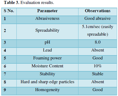 - Smoothness: The Smoothness was tested by rubbing the paste formulation between the fingers [1,2,5,7,8].Determination of sharp and edge abrasive particles: To check the presence of any sharp or tight particles 15-20 cm. Dismiss long-length material on fingers and butter paper. Repeat the same process for at least 10 times. No sharp or firm particles were found [1,2,5,7,8].