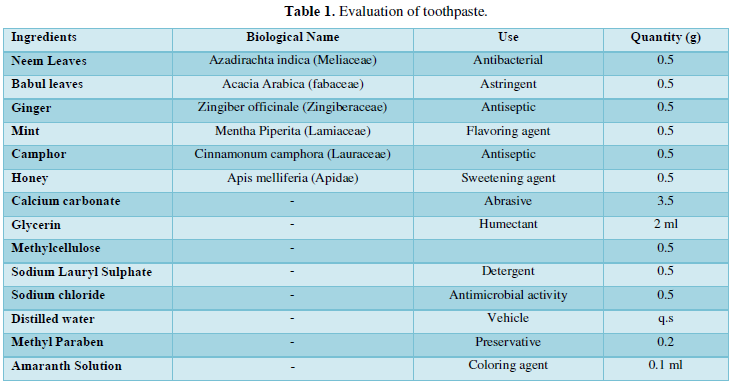 Keywords: Herbal toothpaste, Evaluation, Oral hygiene