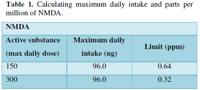 Ranitidine medications are generally available in two different strengths as 150 mg and 300 mg tablets. The maximum daily intake of NDMA is 96.0 nanograms. The limits are based on the maximum daily intake for each impurity derived from animal studies. Dividing these by the maximum daily dose for each active substance gives the limit in parts per million. For the available strengths 150 mg and 300 mg, the limits measured were 0.64 ppm and 0.32 ppm (Table 1) respectively which exceeds 0.16 ppm, the currently agreed threshold for NDMA in ranitidine hydrochloride [12]. Ranitidine is expected to have very low concentration of NDMA formation but it can be maximized in some conditions which should be avoided [13].