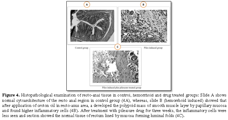 normal cytoarchitecture of the recto anal region in control group (4A), whereas, slide B (hemorrhoid induced) showed that after application of croton oil in recto-anus area, a developed the polypoid mass of smooth muscle layer by papillary mucosa and found higher inflammatory cells (4B). After treatment with pilescure drug for three weeks, the inflammatory cells were less seen and section showed the normal tissue of rectum lined by mucosa forming luminal folds (4C).