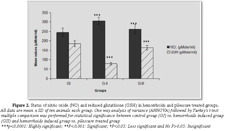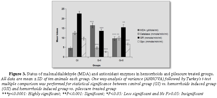The results revealed that a significant (p<0.0001) enhancement of malonaldialdehyde (MDA) and nitric oxide (NO) levels in hemorrhoid induced group as compared with normal control group. These levels were found statistically significant (p<0.0001) decreased in hemorrhoid plus pilescure treated group after 21 days treatment and come back to control group (Figures 2 and 3).
