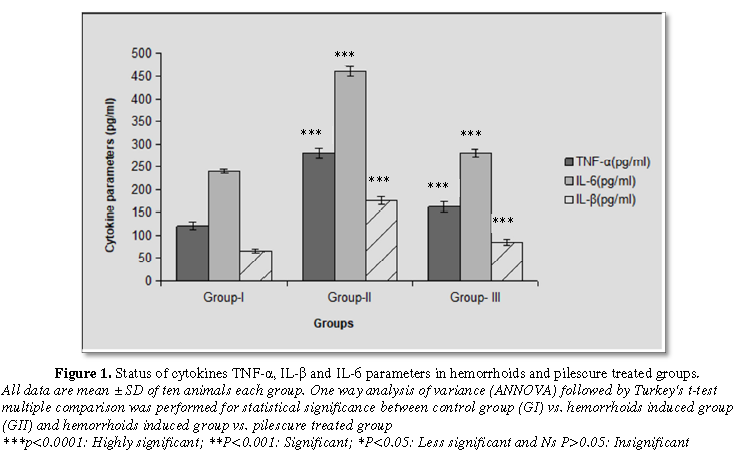 A significant (p<0.0001) enhancement was found in the tumor necrosis factor-α (TNF-α), Interlukin-beta (IL-β) and Interlukin-6 (IL-6) levels in the serum of hemorrhoid induced group after administration of croton oil application. After treatment with pilescure drug for 21 days, these inflammatory parameters were found significantly (p<0.0001) reduced in the treated group and all levels were come back near to control group (Figure 1).