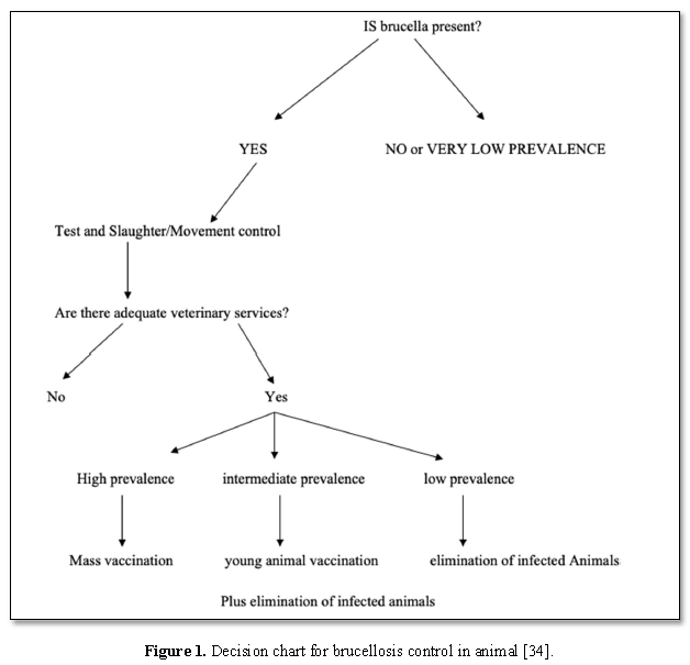 Generally, the following guidelines which should be considered for control of brucellosis: Proper diagnosis; Scheduled vaccination programs for young animals; Screening of herds, livestock markets, abattoirs & subsequent removal of diseased; Awareness among the farmers, livestock & public health authorities(Figure 1) [26]