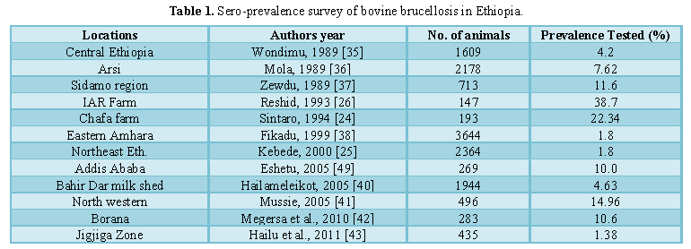 Prevalence: Serological investigation on the prevalence of bovine brucellosis in Ethiopia has been carried out in different parts of the country for the last decades. Several investigators have established the endemicity of bovine brucellosis in different parts of the country and the available information on brucellosis clearly showed that the disease is endemic and widely spread with significant economic and public health importance [6].The importance of Bovine Brucellosis and its prevalence in Ethiopia has been reported by different researchers and it is indicated in Table 1.