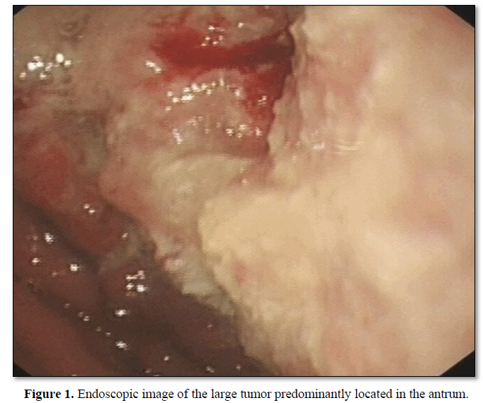A 60-year-old Egyptian male with a two-month history of upper abdominal pain and Anemia was admitted to the local area hospital in Kuwait. Initially, the patient did not show any symptoms of nausea, vomiting, dysphagia or melena. The physical examination and routine laboratory tests upon admission showed anemia. The upper gastrointestinal endoscopy revealed a protruding mass located in the antrum. This mass was approximately 12 cm in diameter and displayed surface bleeding (as seen in Figure 1).