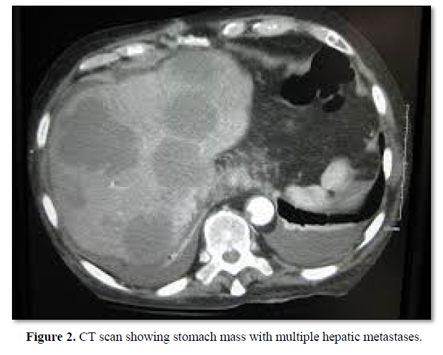 Metastatic SCC of the stomach mainly develops via the lymphatic route rather than the bloodstream route. The most prevalent primary sites are the lung, liver, bone [12]. PET scan is currently one of the most rigorous methods and provides useful information for detecting suspicious metastasis. In our case CT scan confirmed metastatic disease in liver so we did not go for PETCT. The prognosis of gastric SCC is contradictory. Some reports have indicated that primary gastric SCC has a more favorable prognosis compared with gastric adenocarcinoma [2,13], whereas others have suggested the opposite [3-5]. The overall survival of patients with gastric SCC is from 7 months to 8 years [14-16]. In our case the patient is doing well with palliative chemotherapy. Now he is surviving after 5 months of his diagnosis.