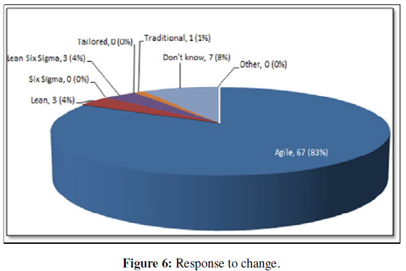 Change management is a comprehensive, cyclic, and structured approach for transitioning individuals, groups, and organizations from a current state to a future state with intended business benefits. It helps organizations to integrate and align people, processes, structures, culture, and strategy (PMI Managing Change in Organizations, 2013). Survey results significantly indicate, as shown in Figure 6, that governance processes based on agile methods leverage organizational capabilities in response to change (83%). Front-end adaptation governance process builds elasticity towards organizational changes impacting portfolio processes, enabling rapid process formation, gap/impact analyses, determines process waste, and estimates values stream.