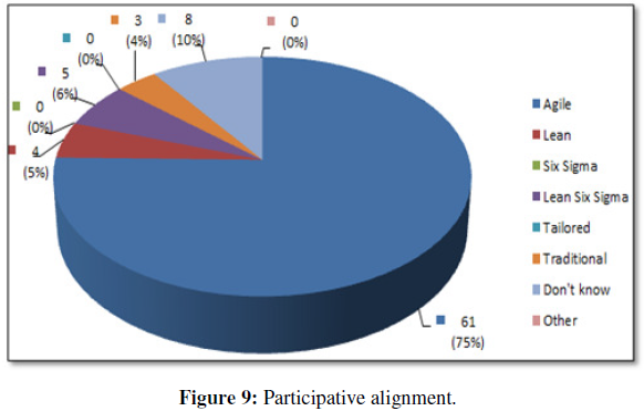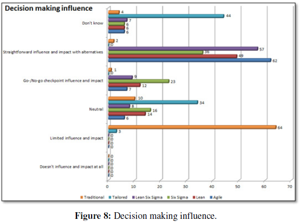 As shown is Figure 8, survey results indicated that the lightweight methodologies (agile 64 or 76% of all responds, Lean Six Sigma 57 or 70%, Lean 49 or 60%, and Six Sigma 36 or 44%) have straightforward influence on governance decision-making process, including the impact of a decision. It is obvious that the traditional decision-making process is having limited decision-making influence and impact (64 or 79% of all responds).