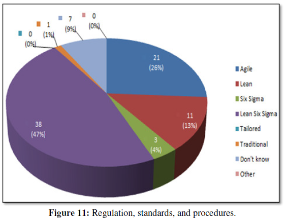 Lean Six Sigma was recognized as a method which builds a minimum reasonable set of organizational regulation, standards and procedures, and balances this regulatory value system the most (47% of respondents). Other lightweight methods are following (agile 26%, and Lean 13%). Traditional methods collected 1% of responses, indicating that the regulative documentation management is the area of concern. Regulation, policies, standards, functional processes and procedures, and standard operating procedures and instructions are part of the quality management system for an organization, with the aim of achieving organizational quality objectives. Quality management principles include a strong customer focus, the motivation and implication of top management, the process approach, and continuous improvement. The quality management system’s best practices are standardized and regulated by the family of ISO 9000 standards (Figure 11).